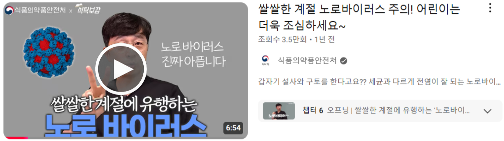 바쁘신 분들은 아래 식약처 공식 영상에서 노로바이러스에 대해 확인해 보세요.